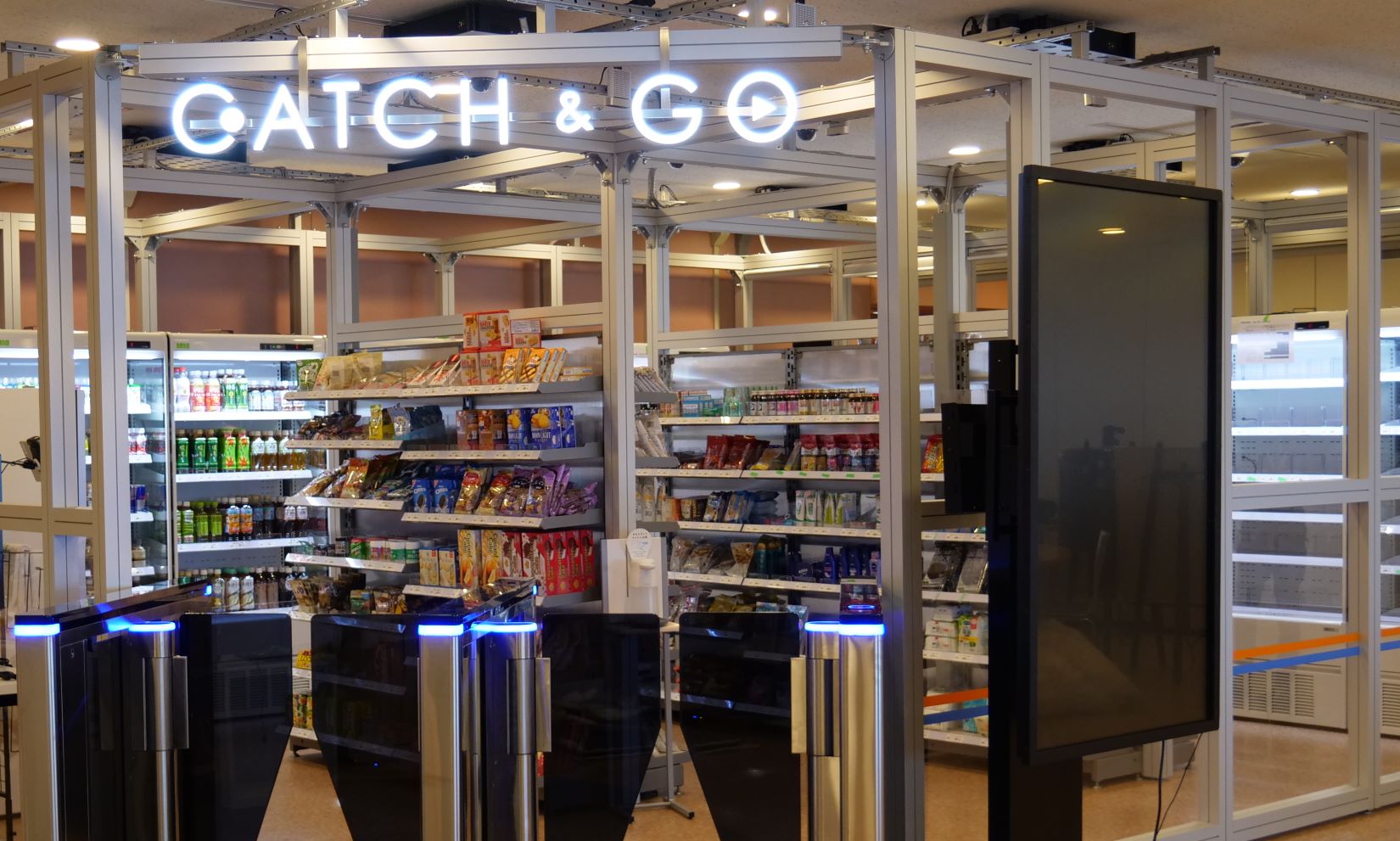 事前登録しておいたスマートフォンのアプリにあるバーコードをかざして入店すると自動的に認証されます。消費者が手に取った商品は棚の重量センサーと店舗に設置したカメラからの情報によって自動検知され、あらかじめ登録されたクレジットカード情報によって自動決済。店舗を出てまもなく、すべての決済が完了しています。