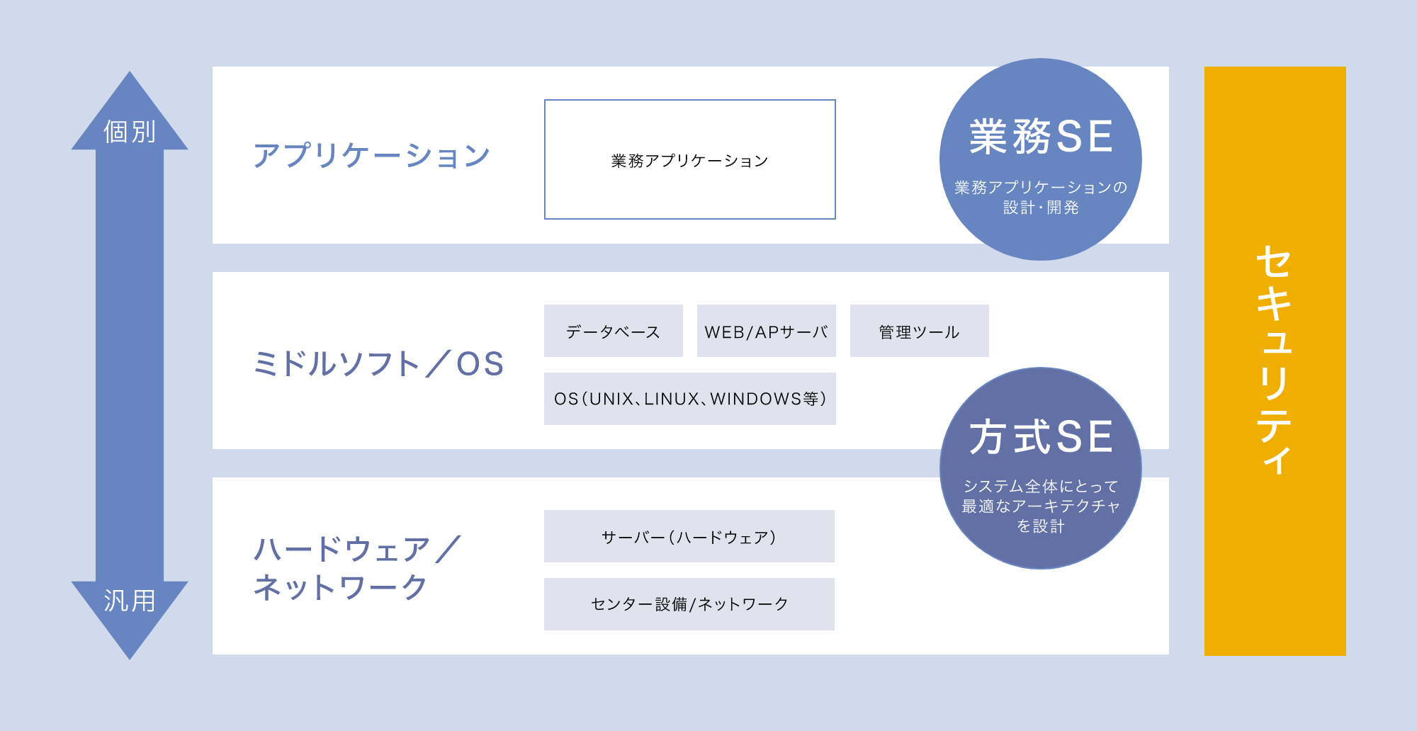 - サーバやネットワーク、データベース等の要素技術に軸足を置き、最適な組み合わせ(アーキテクチャ)の設計、実装