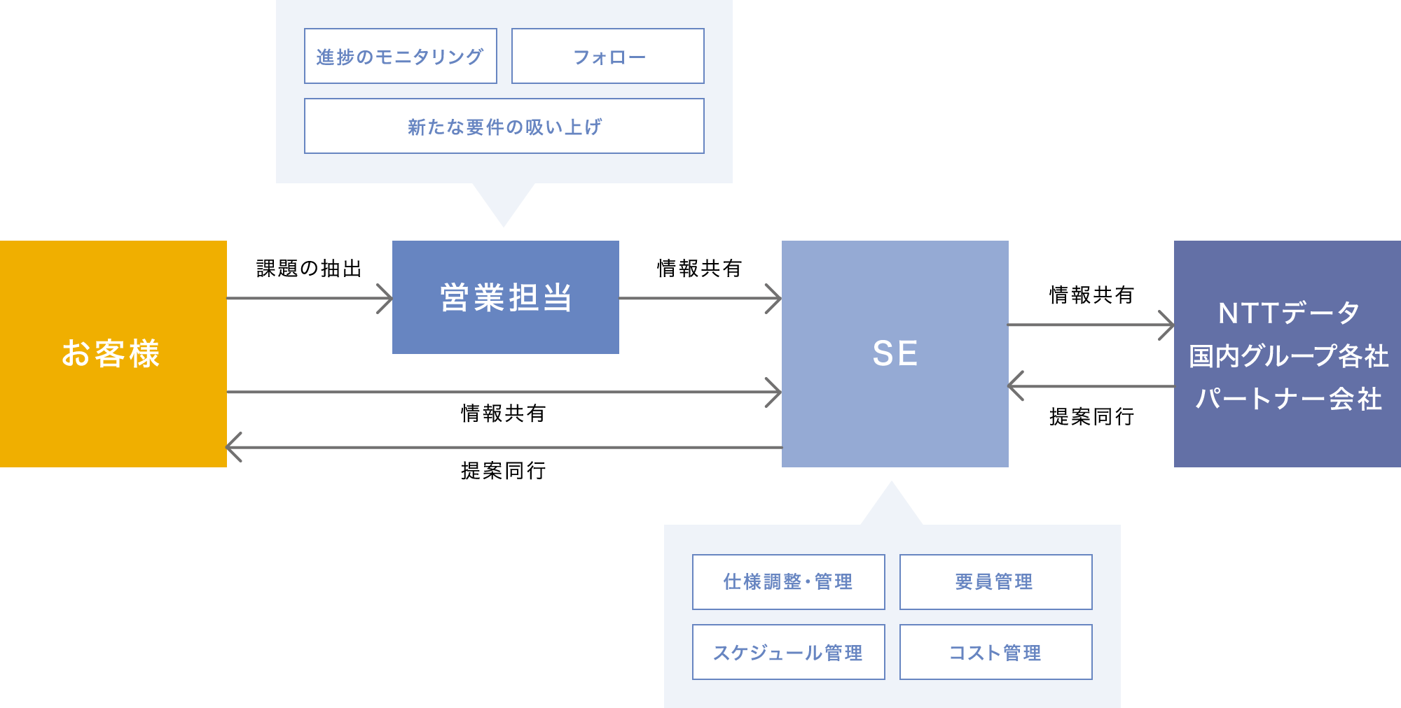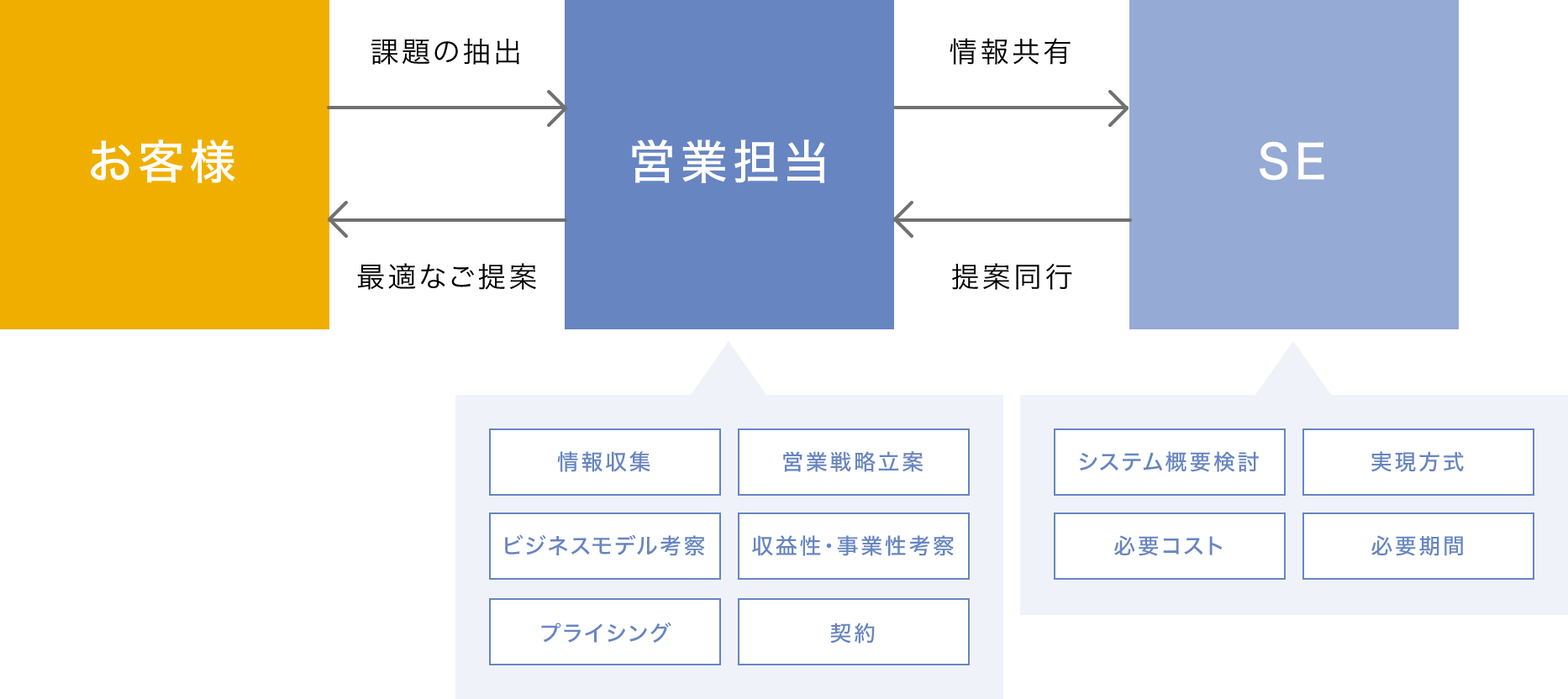 この間、営業は進捗モニタリングやお客様のフォロー、新たな要件発掘などを行います。
